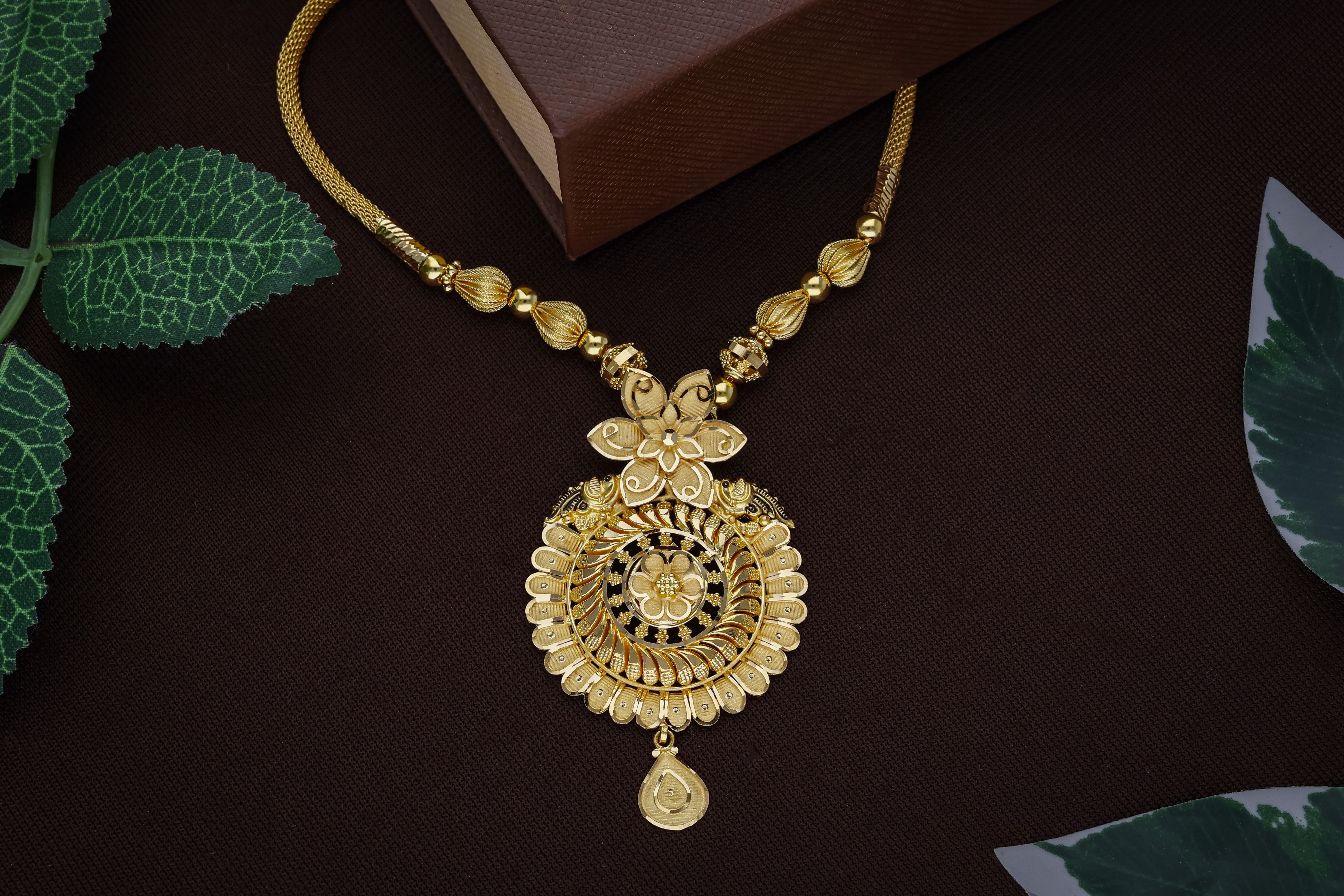 This sophisticated 22K gold necklace from Arundhati Jewellers features a circular mandala pendant with intricate floral jaali lattice, peacock motifs, and cascading bead drops on beaded chains. A temple-style heirloom showcasing Odisha's filigree artistry, perfect for weddings, receptions, and festive wear. Elevates sarees and lehengas with timeless elegance.