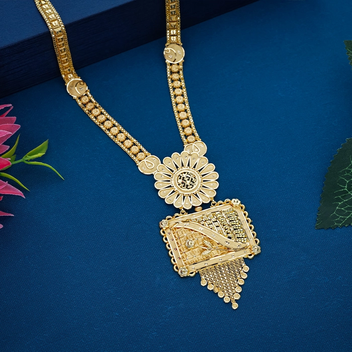 Discover the divine allure of this 22K gold lotus floral pendant necklace from Arundhati Jewellers, Odisha's largest jewellery brand. With a radiant central daisy-like lotus bloom, rectangular jaali frame accented by paisley motifs, beaded fringes, and robust beaded chains inspired by sacred temple designs, it exemplifies exquisite craftsmanship. Perfect for weddings, pujas, or festive elegance, this necklace captures timeless heritage and radiant sophistication.