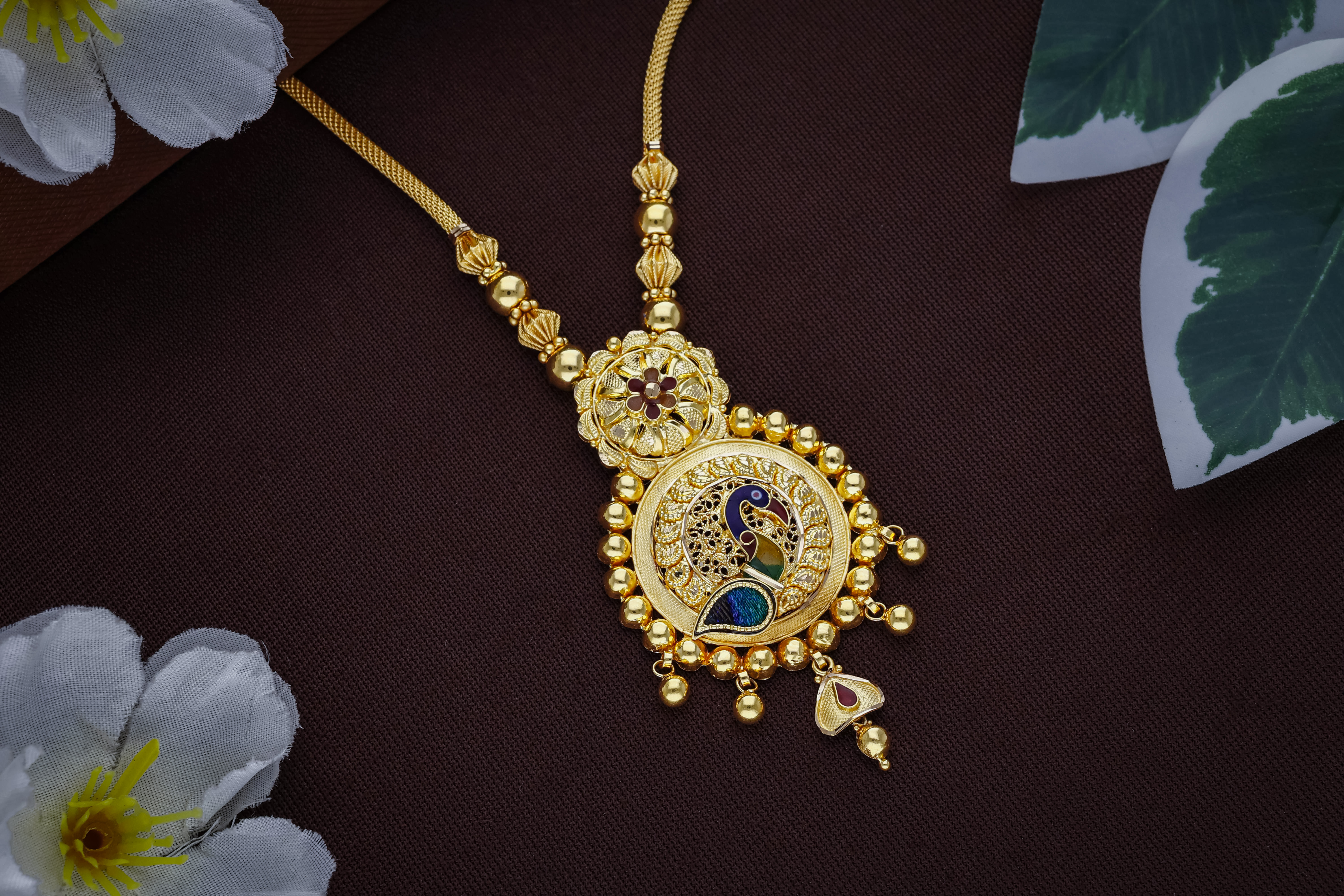 This vibrant 22K gold Rani Haar from Arundhati Jewellers features a stunning peacock motif pendant with colorful enamel work in blues and greens, flanked by floral accents and beaded drops on delicate chains. A temple-style masterpiece showcasing Odisha's artistic heritage, perfect for weddings, receptions, and festive celebrations. Adds regal vibrancy to sarees and lehengas.