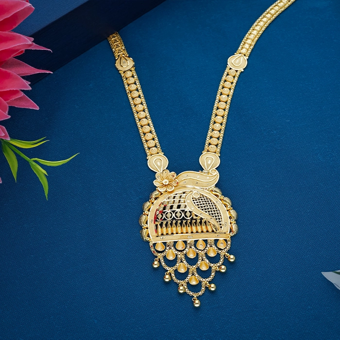 Celebrate heritage with this striking 22K gold peacock floral pendant necklace from Arundhati Jewellers, Odisha's largest jewellery brand. Featuring a bold central peacock motif framed by a radiant floral bloom, intricate jaali netting, dangling beads, and robust beaded chains drawn from traditional temple inspirations, it reflects unparalleled craftsmanship. Ideal for weddings, festivals, or special occasions, this necklace embodies regal charm and timeless radiance.