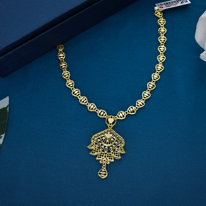 Discover the refined elegance of this 22K gold Turkish filigree short necklace from Arundhati Jewellers, Odisha's largest jewellery brand. Featuring a distinctive Turkish design with ornate link detailing and a delicate filigree pendant, it showcases graceful craftsmanship and timeless charm. Ideal for festive wear, celebrations, and elegant everyday styling, this piece adds a sophisticated touch to any look.