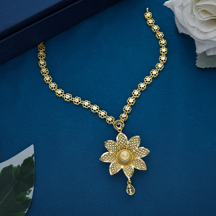 Discover the delicate charm of this 22K gold Turkish floral short necklace from Arundhati Jewellers, Odisha's largest jewellery brand. Designed in an elegant Turkish pattern with a graceful floral link chain and a lotus-inspired pendant with fine filigree detailing, it reflects refined craftsmanship and timeless beauty. Perfect for festive wear, light occasions, and elegant styling, this necklace adds a soft traditional touch to any look.