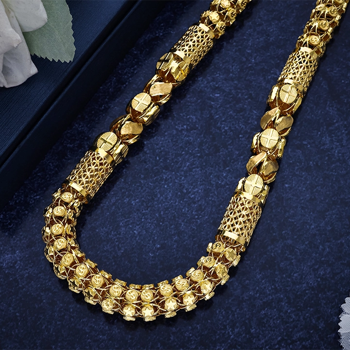 This premium 22K gold chain for men showcases a bold, detailed pattern crafted for a powerful and refined look. Designed as a long gold chain for men, it blends traditional artistry with the latest gold chain designs for a standout presence. A perfect lightweight gold chain for gents, offering comfort, durability, and timeless elegance for every occasion.