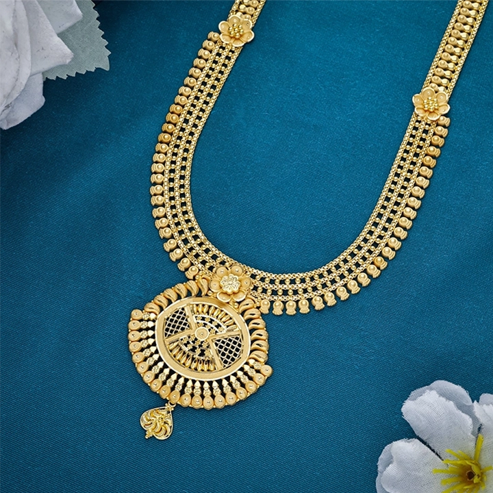Elevate ethnic looks with this 22K Layered Filigree Gold Long Necklace from Arundhati Jewellers. Multi-strand chain with floral circular pendant and drops—ideal for weddings, pujas, or grand occasions.