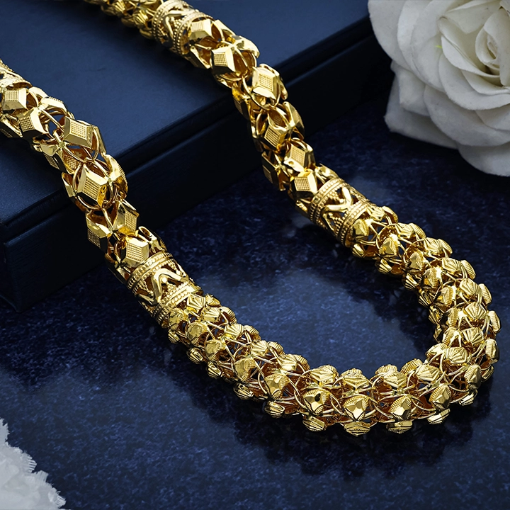 Crafted in pure 22K gold, this Gold Chain for Men features an intricate, bold design that reflects strength and sophistication. Designed as a lightweight gold chain for men, it offers superior comfort for daily wear while maintaining a premium, luxurious appeal. A perfect long gold chain for men, this latest gold chain design adds timeless elegance to every modern gentleman’s collection.