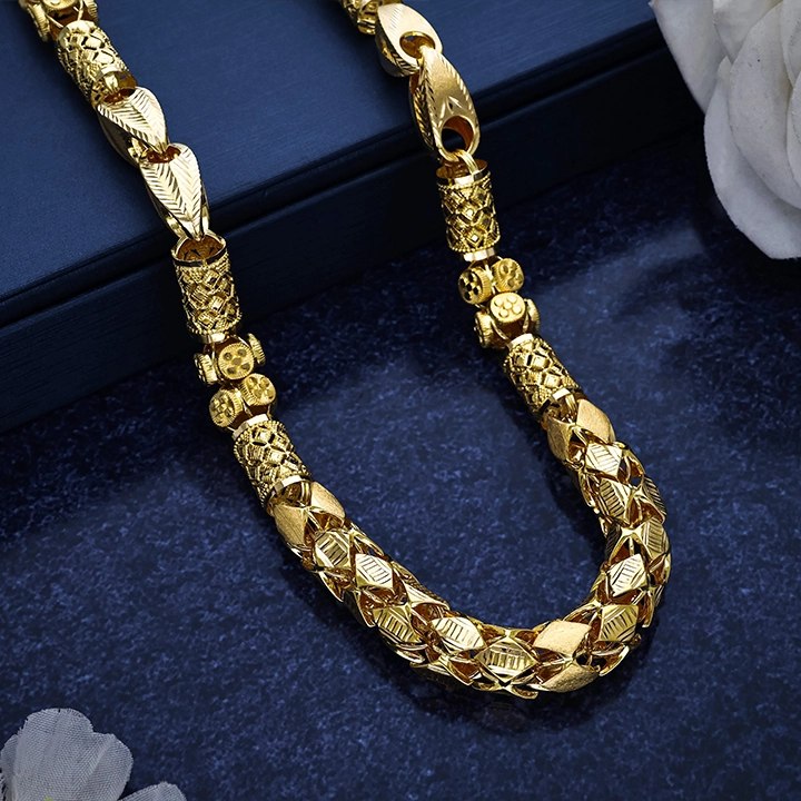 This exquisite 22K gold chain for men showcases a bold and detailed pattern crafted for a rich, royal appearance. Designed as a long gold chain for men, it highlights the latest gold chain designs with a perfect blend of tradition and modern style. A lightweight gold chain for gents that ensures comfort, durability, and timeless elegance for every special occasion.