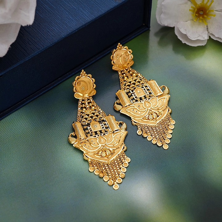 Celebrate heritage with these 22K Temple Moon Gold Jhumka Earrings from Arundhati Jewellers. Crescent tops, ornate tower designs, and fringe drops perfect for weddings, festivals, or traditional elegance.