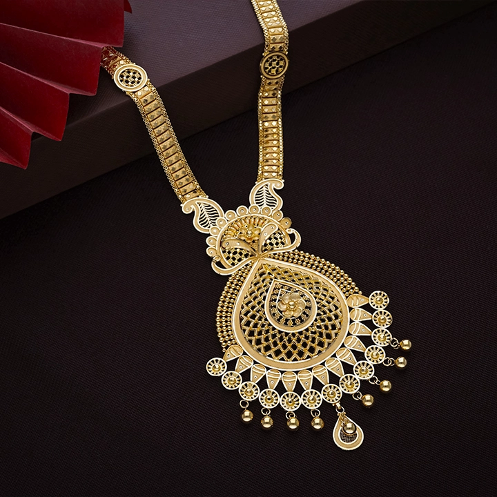 Discover stunning Long Gold Necklace Designs crafted with intricate antique detailing and timeless elegance. This Bridal Long Necklace is perfect for weddings and festive occasions, offering a graceful Gold Necklace for Women who love tradition. Shop this beautifully designed Gold Long Necklace Online and elevate your jewellery collection today.