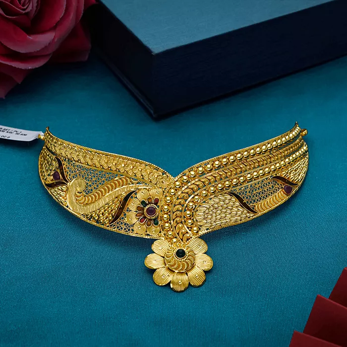 This elegant choker features intricate craftsmanship inspired by timeless Gold Choker Necklace Designs. The flowing motif with floral detailing and subtle enamel accents adds a graceful and artistic touch. Perfect for bridal and festive styling, it enhances every attire with sophistication and charm. Crafted in pure 22KT gold exclusively at Arundhati Jewellers — Odisha’s Largest Jewellery Brand.