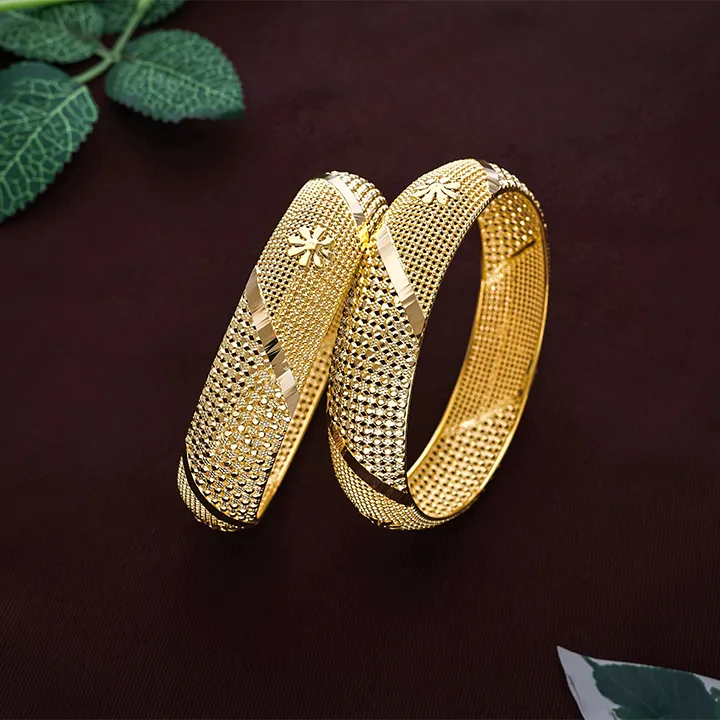 Add festive sparkle with these Diamond-Cut Mesh Gold Bangles from Arundhati Jewellers. Featuring criss-cross textured detailing, star motifs, and gleaming high-polish bands in radiant 22KT gold, they are perfect for weddings, parties, and special occasions.