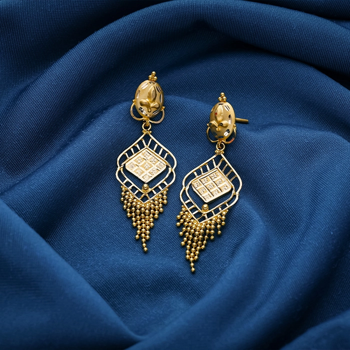 Elevate your ethnic look with these Elegant Lattice Chandelier Gold Earrings, featuring ornate dome tops adorned with floral motifs, intricate latticed diamond frames, and cascading bead tassels for a dramatic, regal sway.