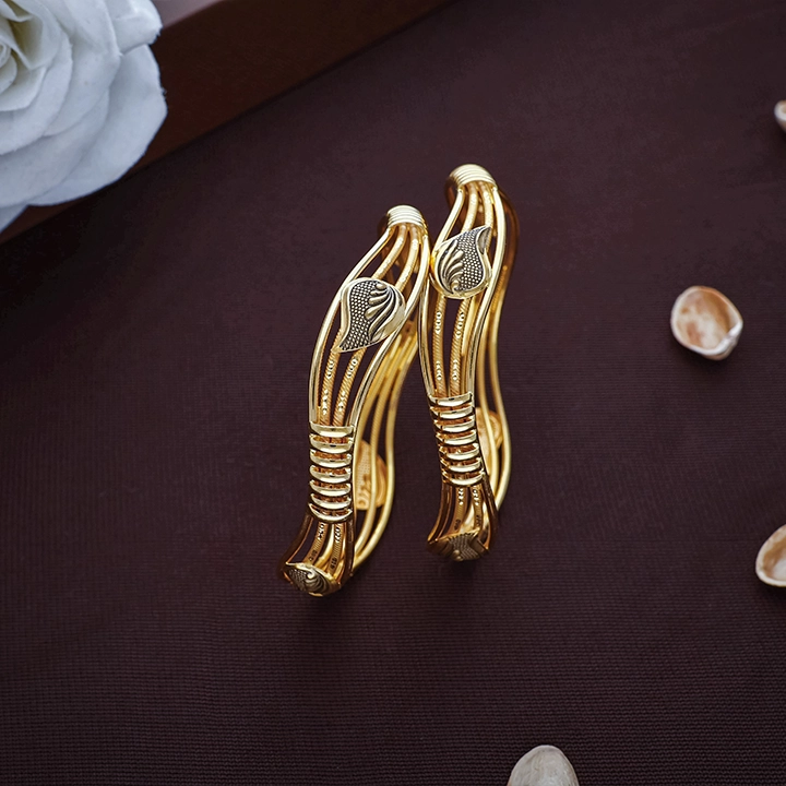 Embrace graceful simplicity with Feather Woven 22K Gold Bangles Pair from Arundhati Jewellers. Sleek woven bands with elegant feather motifs—perfect for modern outfits, daily wear, or subtle festive glamour.