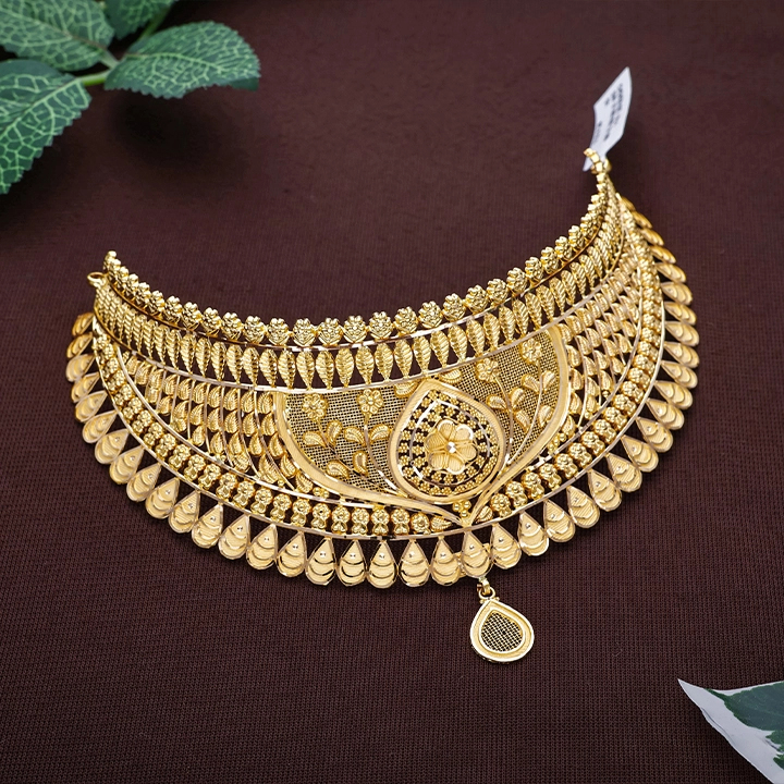 Dazzle with sophistication in Floral Enamel 22K Gold Choker Necklace from Arundhati Jewellers. Intricate floral enamel centerpiece with layered fringe and drops—perfect for bridal necklines, receptions, or statement ethnic looks.