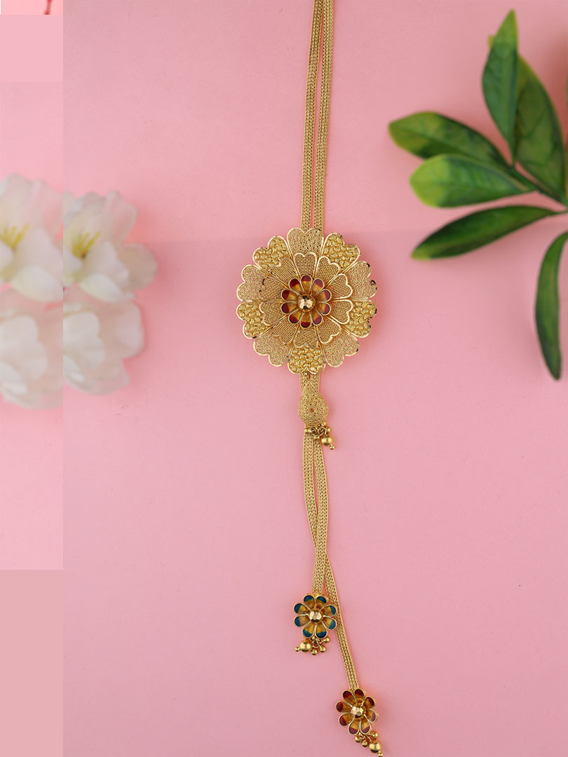 This semi long gold necklace features a beautifully crafted floral medallion paired with fine mesh chains and delicate flower drop accents. Crafted in pure 22K gold, the design reflects intricate detailing with a lightweight, elegant finish. Ideal for festive and traditional wear, adding soft floral charm to ethnic ensembles.