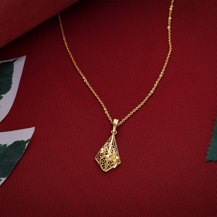 Elevate elegance with a Gold Pendant from Arundhati Jewellers. Showcasing a triangular filigree design with intricate cutwork detailing, perfect for lightweight daily wear with a touch of artistry.