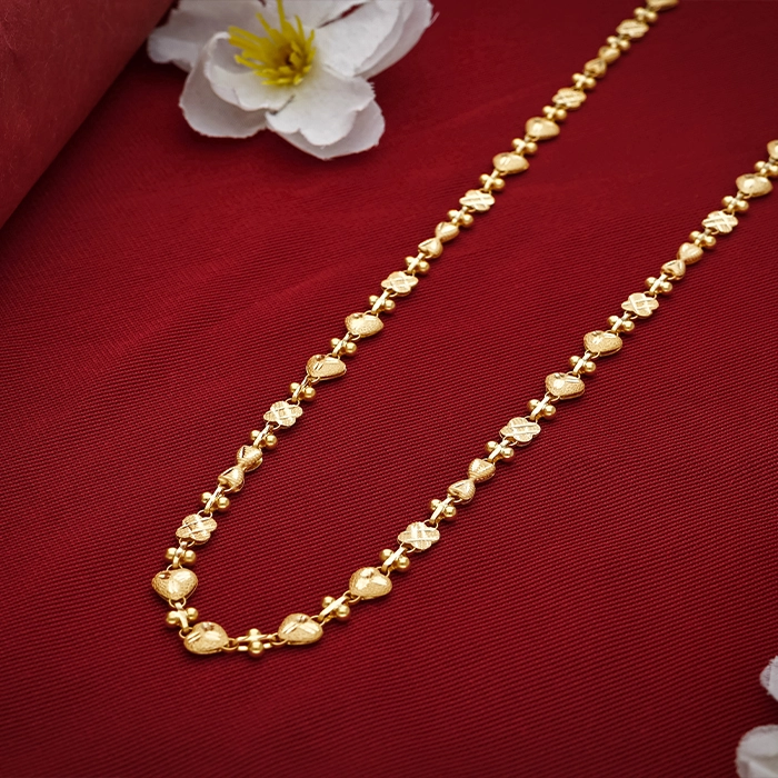 Elevate elegance with a Gold Chain Necklace from Arundhati Jewellers. Delicately crafted with repeating heart-shaped links and textured accents, perfect for daily wear or subtle festive charm.
