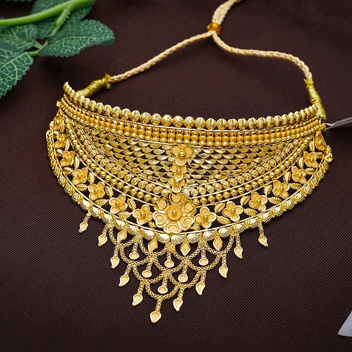 This richly detailed Gold Choker Necklace features layered scalloped craftsmanship with elegant floral accents and graceful hanging drops. Designed as a statement Bridal Gold Choker Necklace, it adds royal charm to wedding and festive ensembles. One of the latest choker necklace designs, this traditional gold choker for women reflects timeless artistry by Arundhati Jewellers — Odisha’s Largest Jewellery Brand.