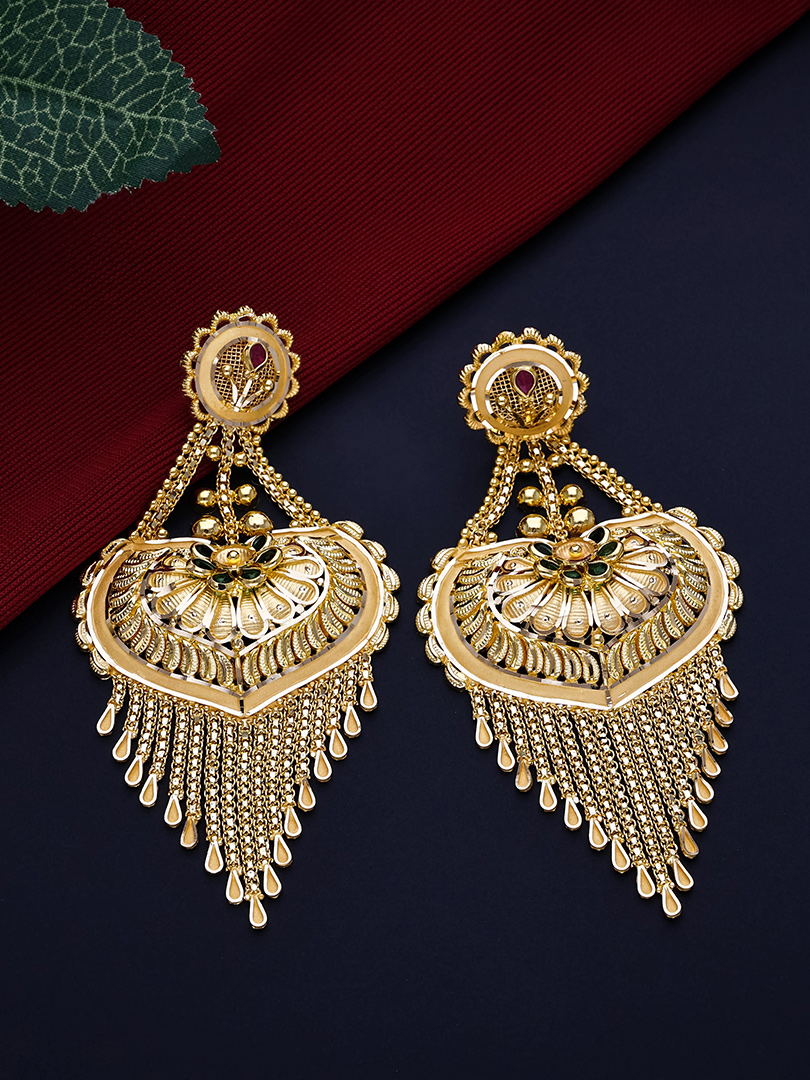 Dramatic gold-finish earrings featuring floral stud tops, heart-shaped filigree medallions with green enamel accents, and cascading chain fringes with teardrop tips—ideal for bridal and festive styling from Arundhati Jewellers.