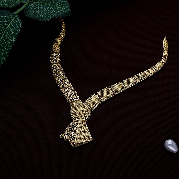 Adorn your special occasion with this exquisite Heart Motif Gold Necklace & Earring Set from Arundhati Jewellers. Crafted in 22KT gold, this set features intricate heart-shaped designs, floral detailing, and elegant danglers, perfect for weddings, festivals, and adding a touch of romance to your look. Experience classic craftsmanship and timeless beauty with Arundhati Jewellers.