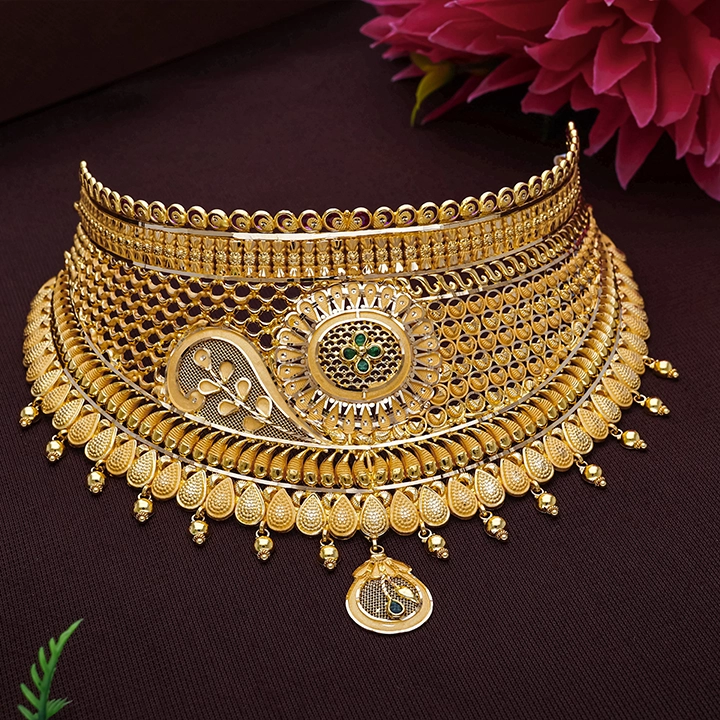 This majestic Gold Choker Necklace features layered traditional detailing with a bold, wide structure that defines bridal elegance. Crafted to reflect heritage artistry, it adds a powerful royal statement to wedding and festive attire. Perfect as a Bridal Gold Choker Necklace, it pairs gracefully with sarees and lehengas. Experience timeless craftsmanship at Arundhati Jewellers - Odisha’s Largest Jewellery Brand, trusted for purity and design excellence.