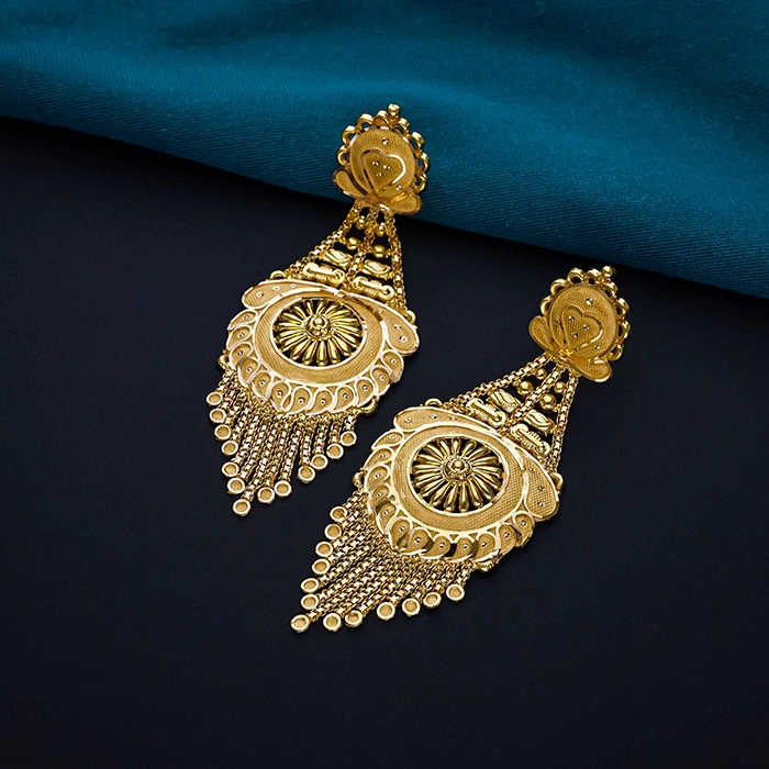 Make a timeless style statement with these beautifully handcrafted gold hanging earrings, featuring a radiant round motif and intricate ethnic detailing. The layered dangling chain design adds graceful movement and sophistication, making them perfect for weddings, festive wear, and cultural celebrations—a standout addition to your jewellery collection — exclusively from Arundathi Jewellers, Odisha’s Largest Jewellery Brand.