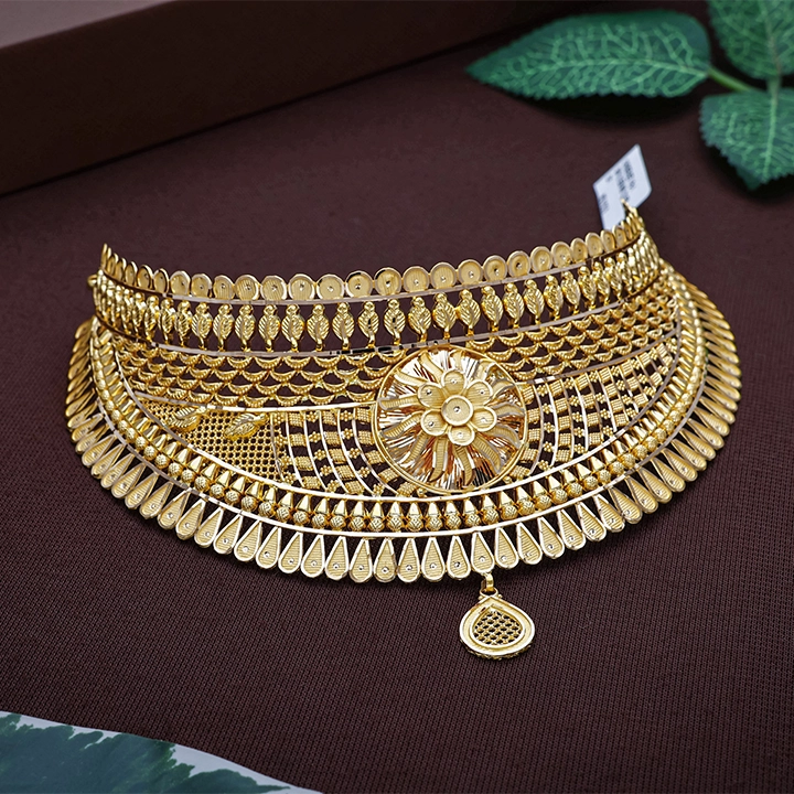 Elevate your style with Layered Floral 22K Gold Choker Necklace from Arundhati Jewellers. Multi-layered design with central floral motif and dangling fringe—perfect for weddings, parties, or traditional ethnic ensembles