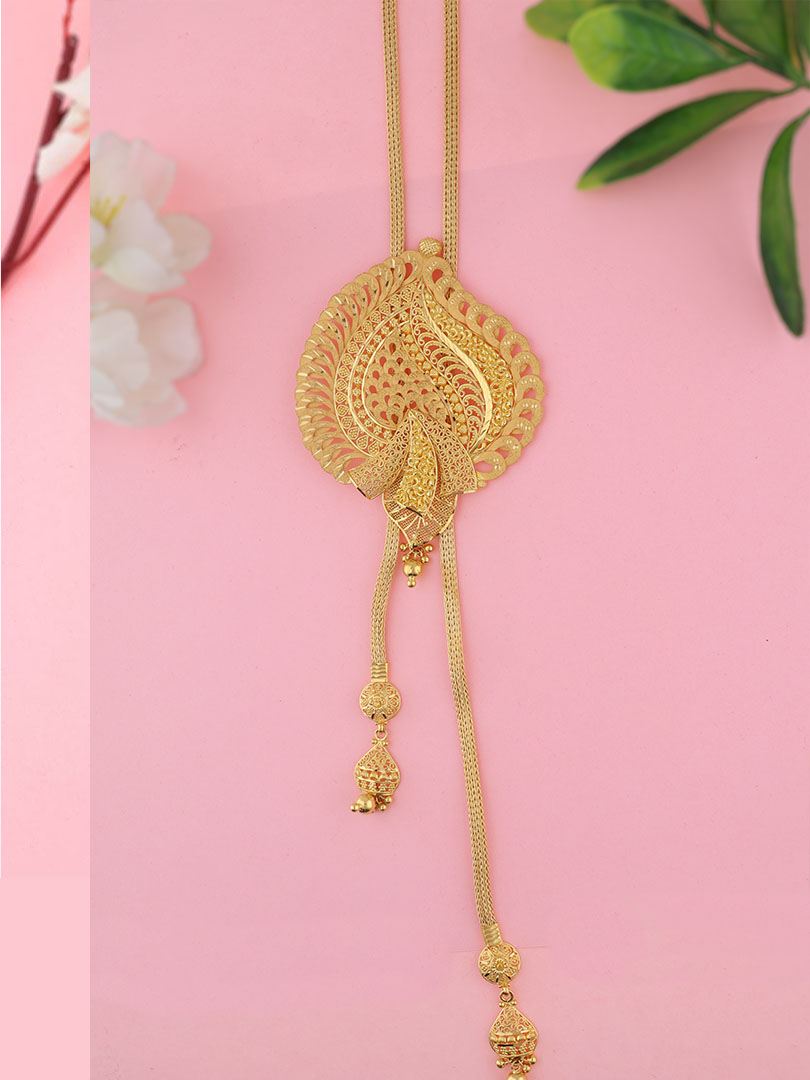 This semi long gold necklace features an intricately crafted paisley-shaped pendant with fine jaali detailing and elegant drop chains. Crafted in pure 22K gold, the design reflects traditional artistry with a fluid, lightweight finish. Perfect for festive and traditional wear, adding classic charm and graceful movement to ethnic outfits.