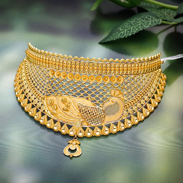 This exquisitely crafted Gold Choker Necklace showcases timeless artistry with intricate mesh detailing and a majestic peacock motif, symbolising grace and heritage. Designed as a statement Bridal Gold Choker Necklace, it perfectly complements wedding and festive attire. One of the latest choker necklace designs, this traditional gold choker for women reflects regal elegance, curated by Arundhati Jewellers — Odisha’s Largest Jewellery Brand.