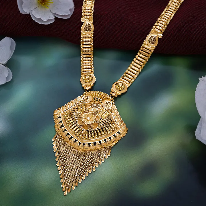 The Rajwada Kanika Antique Bridal Long Necklace is a timeless traditional design featuring intricate detailing and a graceful statement pendant. Crafted in an antique finish, this long gold necklace reflects classic heritage artistry perfect for bridal and festive wear. Its lightweight structure ensures comfort without compromising on grandeur. An elegant gold necklace for women who cherish royal, traditional jewellery.