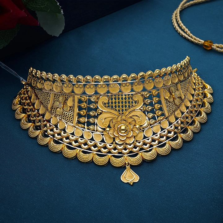 This royal traditional gold choker showcases intricate floral and filigree craftsmanship. Designed for brides who desire a bold and elegant bridal gold choker necklace. A stunning example of the latest choker necklace designs rooted in tradition. Crafted with excellence by Arundhati Jewellers - Odisha’s Largest Jewellery Brand.