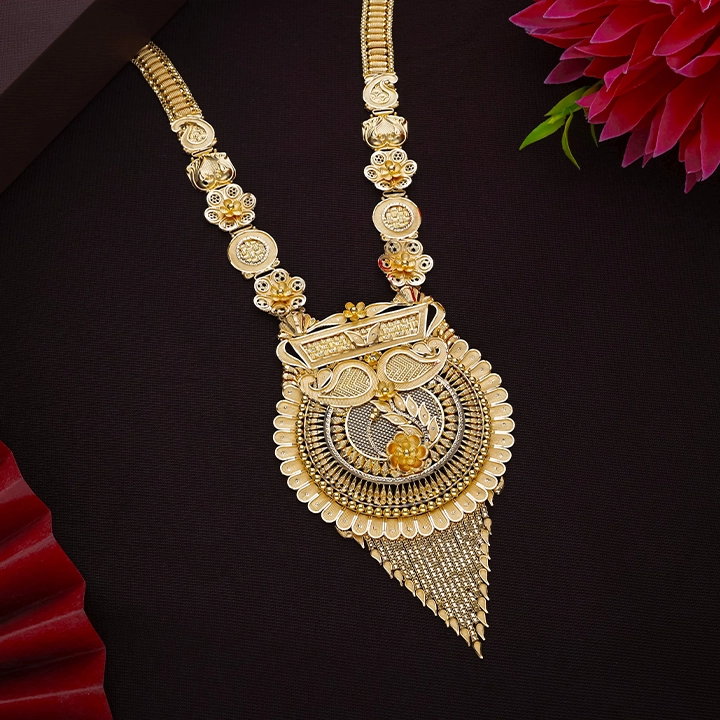 Elevate your traditional look with this exquisitely crafted temple gold necklace, featuring intricate detailing and a grand pendant design. Perfect for weddings and festive occasions, it reflects timeless elegance and cultural richness. A statement masterpiece for those who love classic, heritage-inspired jewellery.