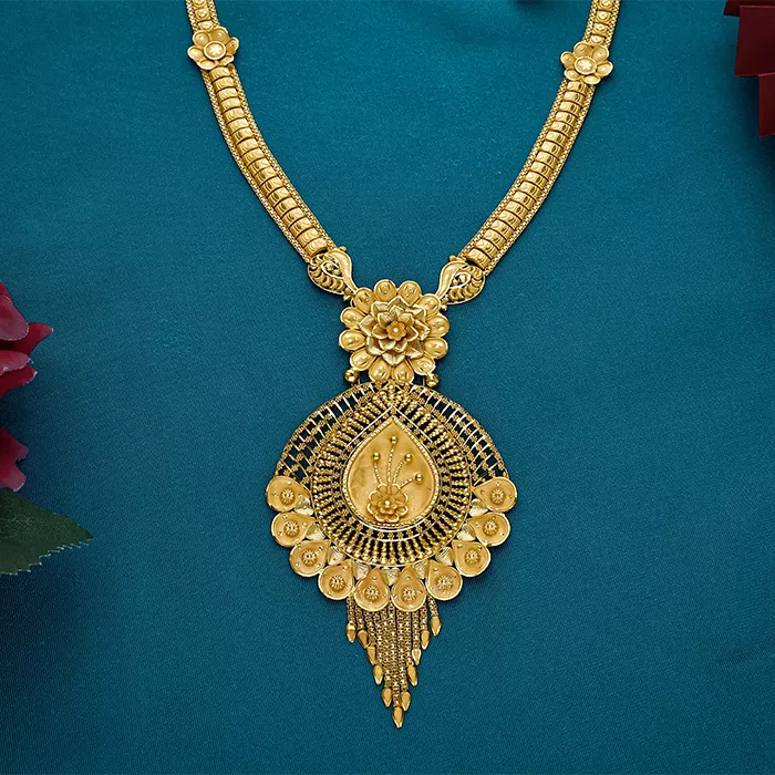 Celebrate timeless elegance with this exquisitely crafted long gold necklace featuring intricate floral artistry and fine detailing. Designed with a bold traditional pendant, this piece beautifully reflects Odisha’s rich heritage and craftsmanship. Perfect for bridal wear and grand celebrations, it adds unmatched grace and royal charm to every look. A masterpiece from Arundhati Jewellers—where tradition meets luxury in pure 22KT gold.