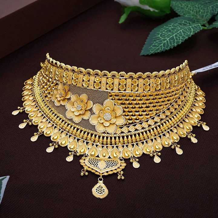 This stunning Gold Choker Necklace is crafted with intricate traditional detailing, making it a perfect choice for bridal elegance. Its wide, regal design enhances wedding and festive attire with timeless charm. Ideal as a Bridal Gold Choker Necklace, it pairs beautifully with classic sarees and lehengas. Discover this masterpiece at Arundhati Jewellers - Odisha’s largest jewellery brand, a symbol of trust and fine craftsmanship.