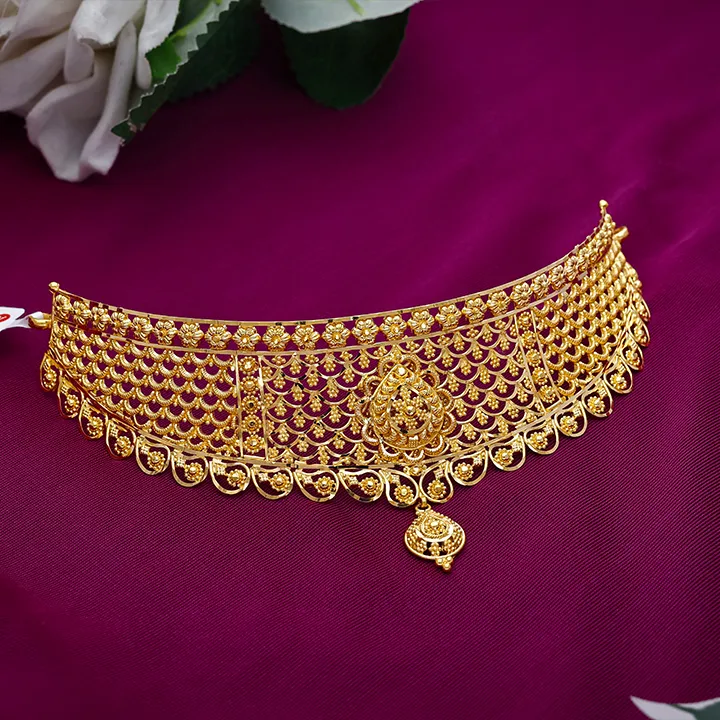 Elegant traditional gold choker necklace designed for timeless beauty and grace. A perfect bridal gold choker that enhances wedding and festive looks effortlessly. Features the latest choker necklace design with intricate craftsmanship and rich finish.
