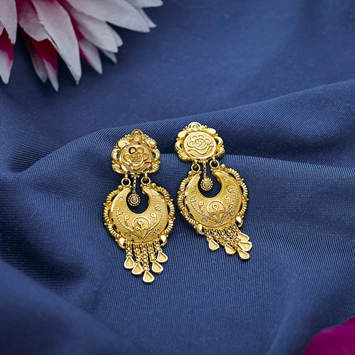 Shimmer with elegance in these Chandelier Gold Dangler Earrings from Arundhati Jewellers. Designed with cascading links, floral motifs, and intricate detailing, these statement earrings are perfect for festive occasions, weddings, and adding a touch of regal charm to your look. Crafted in 22KT gold for lasting brilliance and tradition.