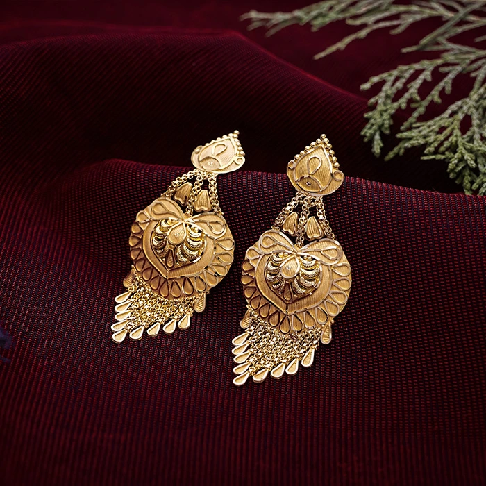 Elevate your festive style with these Ethnic Gold Dangler Earrings from Arundhati Jewellers. Crafted in 22KT gold with intricate cutwork and traditional motifs, these elegant danglers are ideal for weddings, cultural events, and grand celebrations, reflecting timeless craftsmanship and luxury.