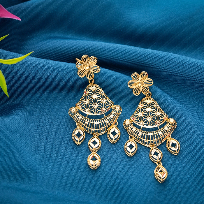 Elevate elegance with Gold Earrings from Arundhati Jewellers. Ornate chandbali drops featuring floral motifs and dangling diamond accents—perfect for modern outfits, daily luxury, or special events.