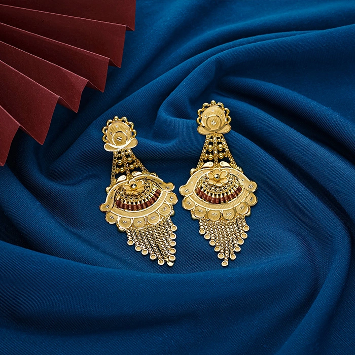 Elevate your ethnic style with these beautifully handcrafted gold hanging earrings featuring intricate detailing and a stunning layered dangler pattern. Designed to complement sarees, lehengas, and festive outfits, they offer a perfect blend of elegance and tradition. A timeless addition to your jewellery collection — exclusively from Arundathi Jewellers, Odisha’s Largest Jewellery Brand.