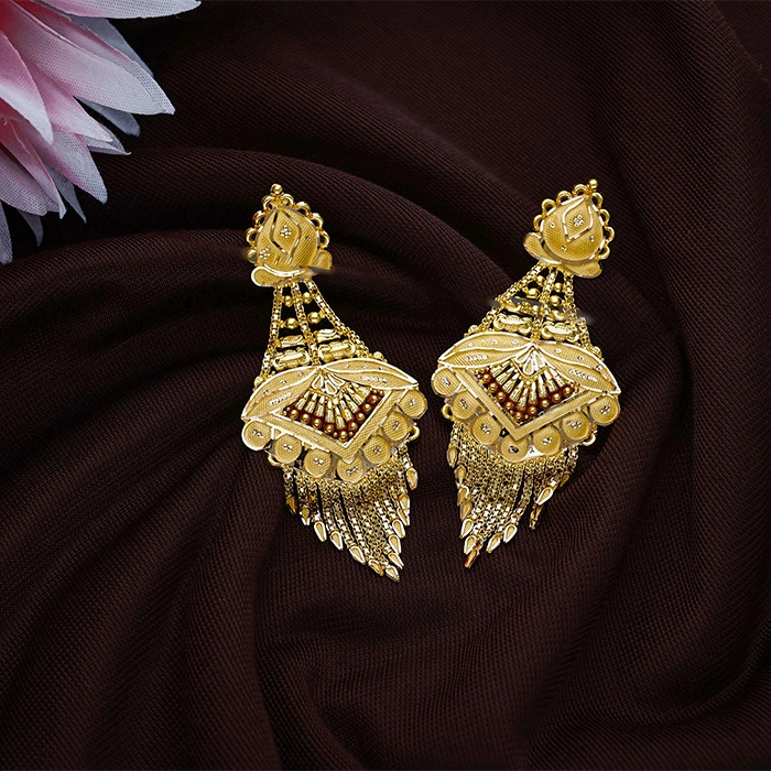 Elevate your festive look with these handcrafted gold hanging earrings, designed with intricate filigree artistry and traditional detailing. The layered dangler style adds movement and elegance, making it a perfect match for sarees, lehengas, and ethnic wear. A timeless pick for weddings, festivals, and grand occasions — exclusively from Arundathi Jewellers, Odisha’s Largest Jewellery Brand.