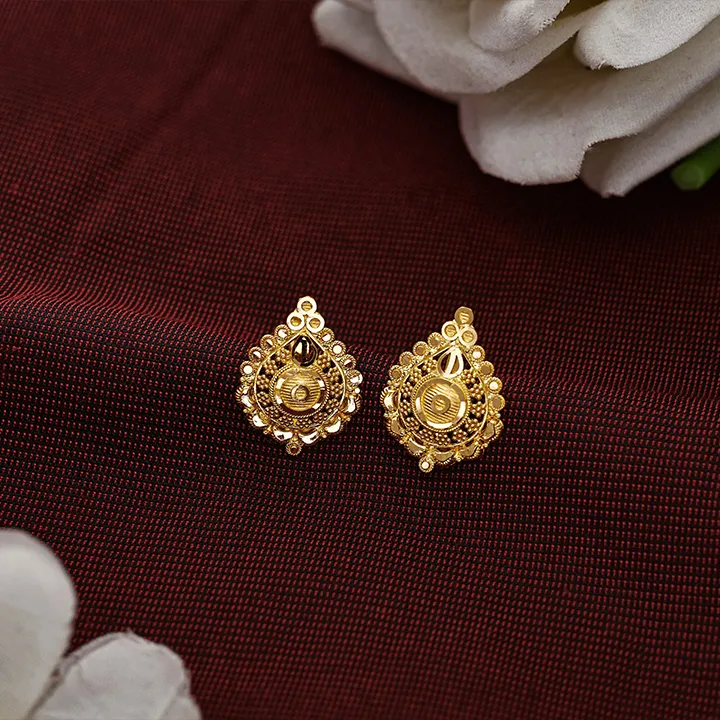 Finely crafted 22K gold stud earrings featuring a graceful triangular motif with rich handcrafted detailing. These lightweight gold ear tops are ideal for daily wear, festive occasions, and elegant ethnic looks. Buy authentic gold stud earrings online with assured quality and the best gold earrings price.